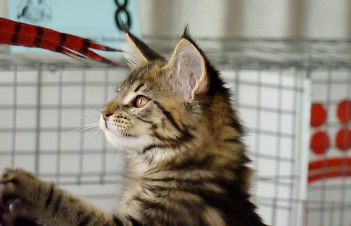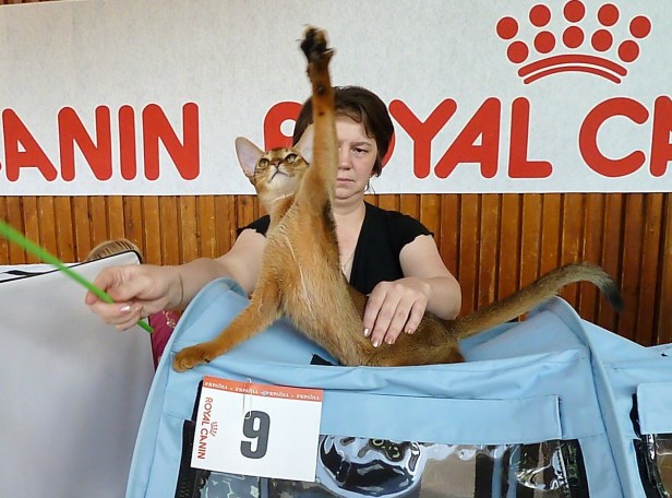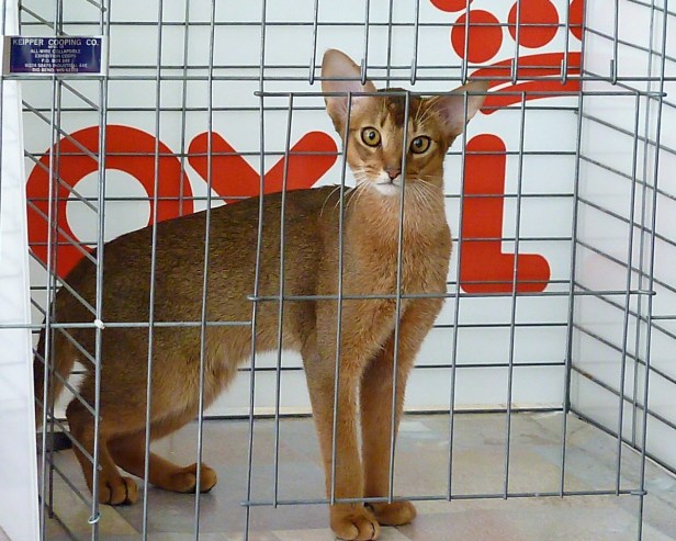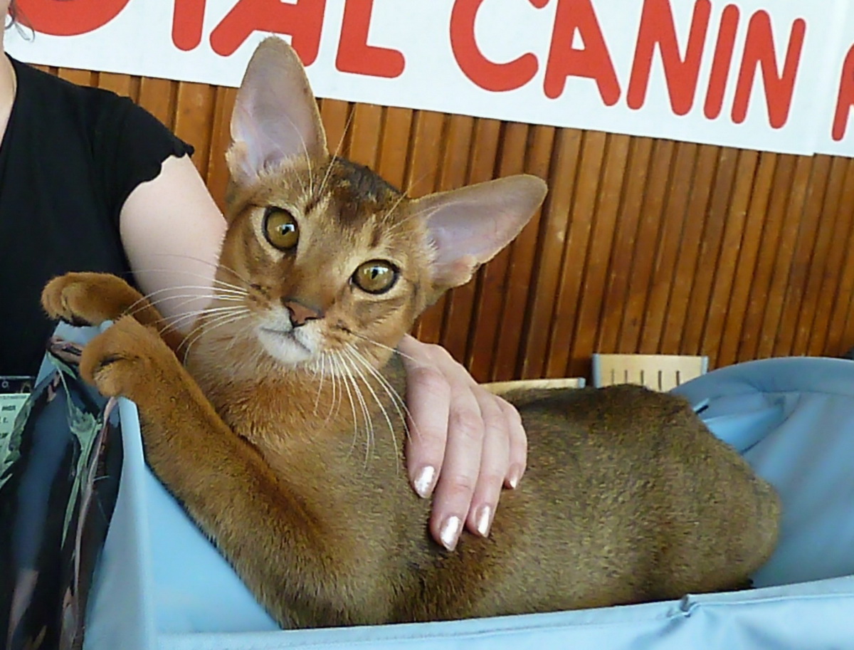 Desde el primer momento quedé prendado de uno de estos simpáticos peluches. Un cachorro de abisinio, delgado y largo como un día sin pan. No paraba de juguetear en todo momento y demostrar su elasticidad y contorsionismo acorde con su figura. Una raza de grandes orejas, cabeza pequeña, rabo largo y delgado y con una cara que recuerda a la del puma americano.
