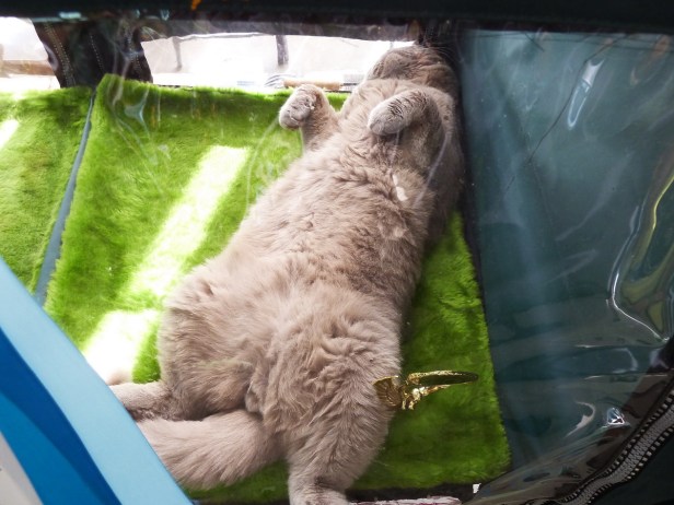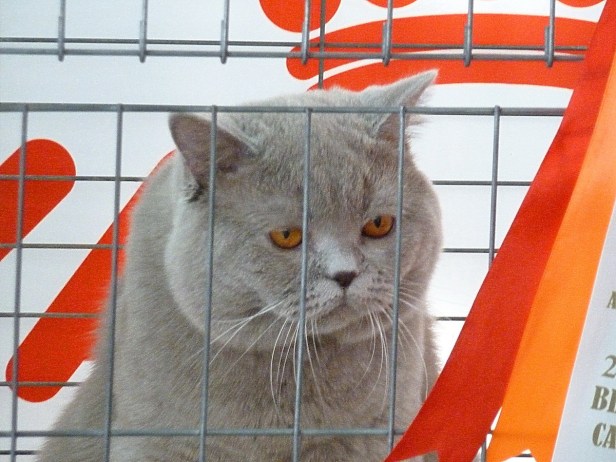 El “angelito” se pasó toda la jornada durmiendo patas arriba como si la cosa no fuera con él. No movió ni un bigote en tres horas. Debía estar más que acostumbrado a sus innumerables premios y su tremendo currículum, por lo que a este tanque peludo solo lo despertaron 5 minutos antes de la prueba, lo peinaron, lo llevaron al expositor, hizo algunas cabriolas y juegos, le dieron el 2º premio absoluto, le devolvieron a su cama… y a seguir durmiendo. Para qué más?, Que trabajen otros…debía pensar esta máquina de acaparar títulos.