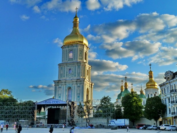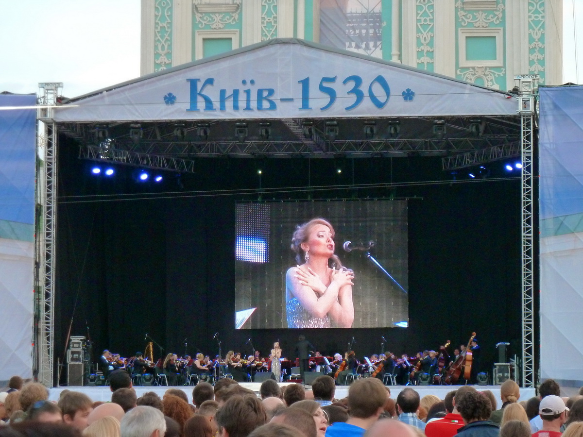 La plaza de Santa Sofía albergaba el escenario para un concierto de música clásica a cargo de la filarmónica de Kiev. En la imagen se ve el escenario central y las estructuras laterales que junto con la fachada del campanario se convertiría en una pantalla gigante para la proyección en 3D de un vistoso corto dedicado a la historia de la ciudad, acompañado de efectos especiales.