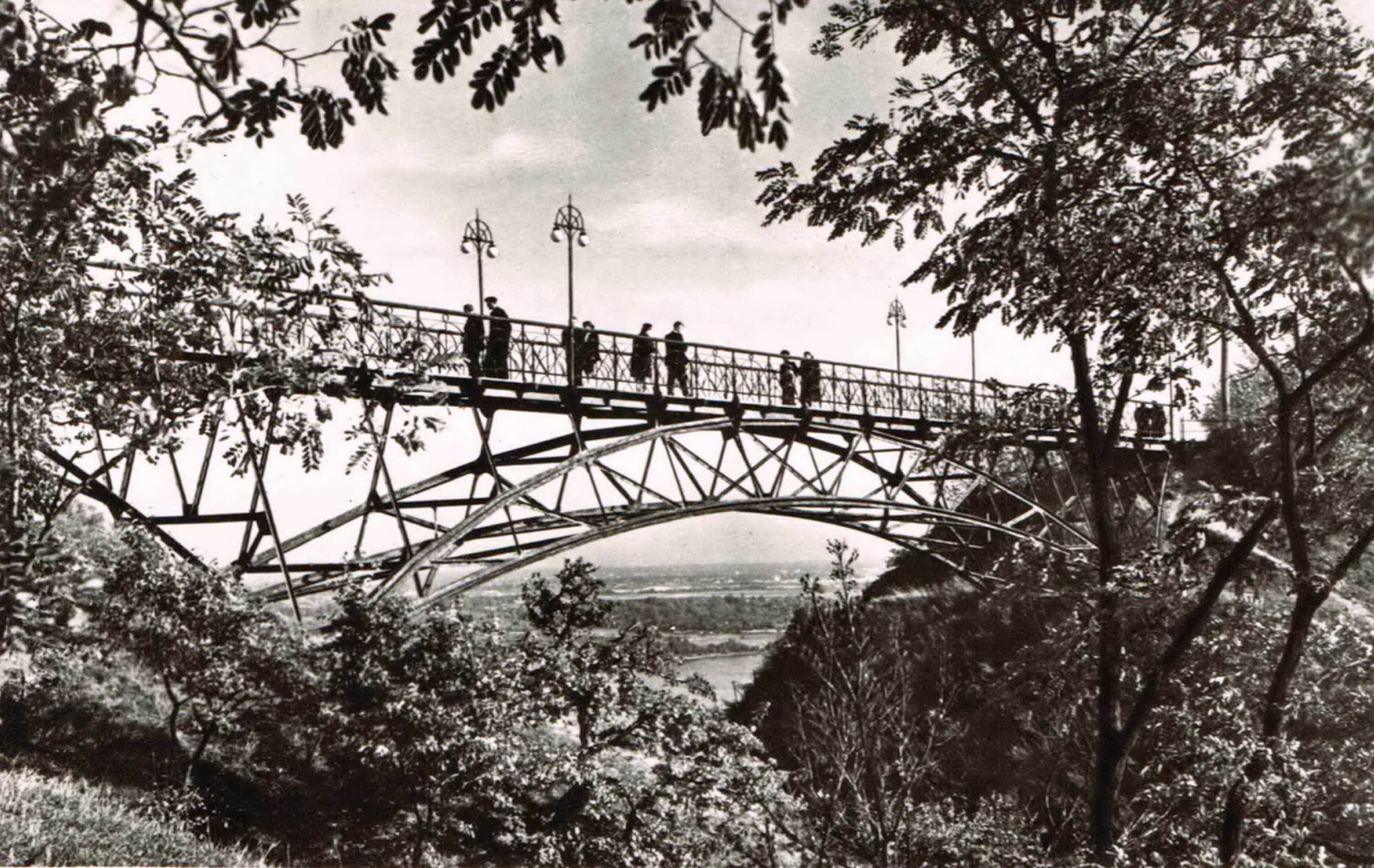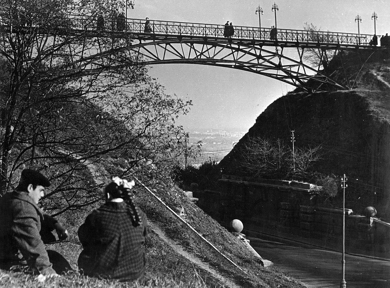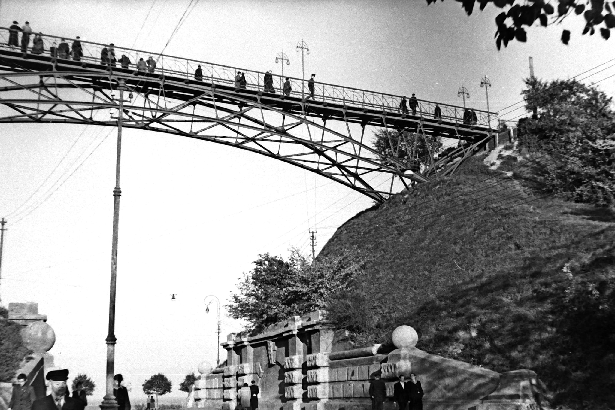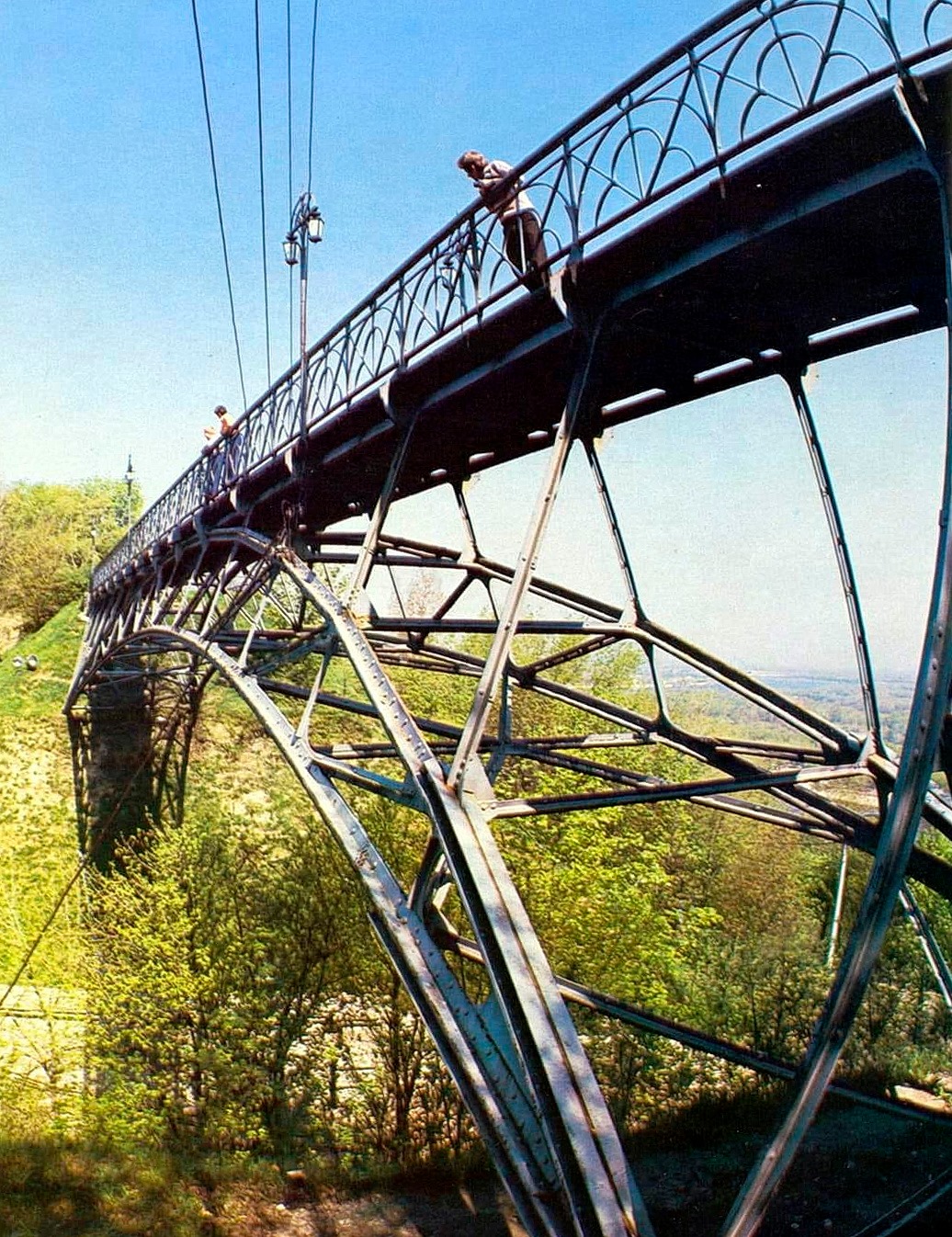 Este bello puente fue diseñado por el ingeniero Evgeny Paton en 1910 y puesto en servicio en 1912. A lo largo del tiempo ha recibido numerosos nombres por los habitantes de Kiev: El pequeño puente Paton (en referencia a su otro gran puente que cruza el río), el puente del diablo, por su aparente fragilidad y altura sobre la calle, además de un desconcertante movimiento de flectado al cruzarlo, el puente del beso, o mayoritariamente conocido como el puente de los enamorados.