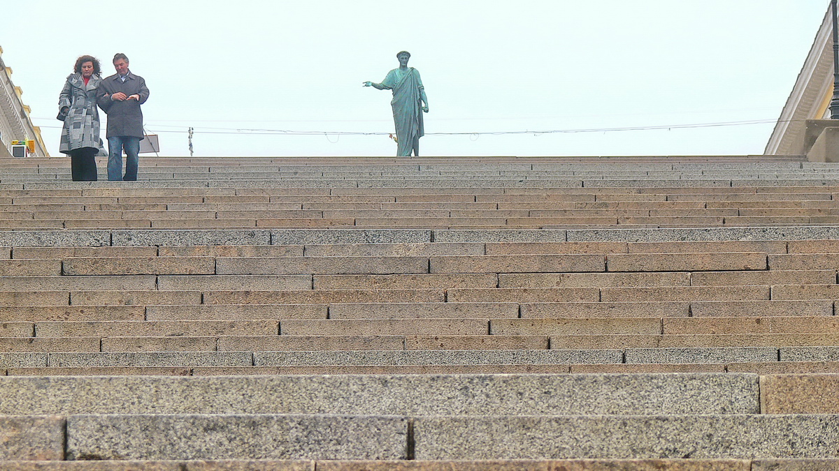 Escalera Potemkin. Arriba en el bulevar Primorsky, la estatua de Armand Emmanuel du Plessis, duque de Richelieu y primer alcalde de Odesa, venerado en la ciudad. Por el centro de la escalera estoy esperando la foto.