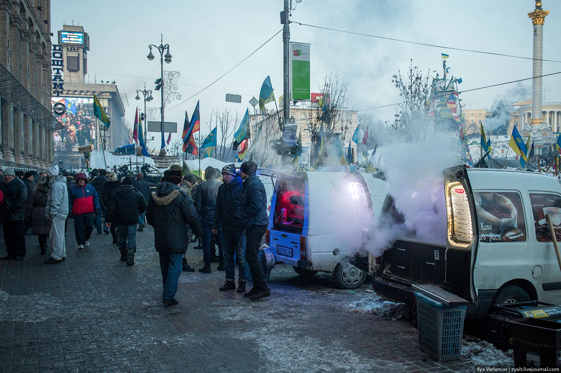 Maidan y la avenida Khreschatik están llenas de casetas prefabricadas y en su mayoría artesanales destinadas a cocinas, guardarropas, primeros auxilios, avituallamiento, almacenes para materiales de construcción como hierros, alambres, maderas, plásticos, toldos y sacos para las barricadas (por cierto, los llenan con nieve, por lo menos en esto el intenso frío juega a favor). Casetas para almacenar agua, leña, combustible y víveres. Puntos de información y de prensa diaria, puntos de limpieza, pequeños tenderetes donde comprar a precio de costo cualquier cosa que se necesite… en toda regla, un pequeño pueblo en movimiento.