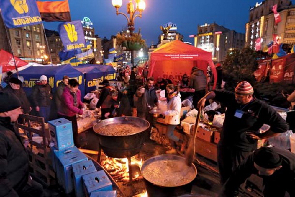 Los medios de comunicación televisivos y la Red nos inundan hasta la saturación con imágenes violentas sobre las revueltas de Euromaidan, pero hay mucha gente que no salen en esas portadas, gente voluntaria que se ofrece para ayudar en la organización que conlleva el mantener a decenas de miles de personas fuera de sus casas cubriendo sus necesidades más vitales. Carpinteros, electricistas, herreros, soldadores, albañiles, cocineros, camareros, amas de casa, jóvenes estudiantes y un sin fin de representantes de todos los gremios conocidos prestan su ayuda y su conocimiento en Maidan Nezalezhnosti (Plaza de la Independencia). Son muchos días a la intemperie con temperaturas que como esta semana de enero caen hasta -23º. Sin este batallón de intendencia silencioso y solidario no se podría mantener en la calle a toda esta gente.