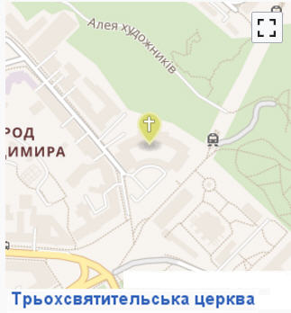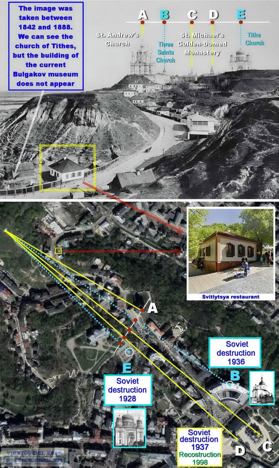 Como se ve en las alineaciones, entre la iglesia de San Andrés (A) y la cúpula mayor y campanario del monasterio de San Miguel (C – D) se divisa la cúpula principal (B) de la desaparecida iglesia de San Basilio, también llamada de los Tres Santos. Василівська (Трьохсвятительська) церква.
