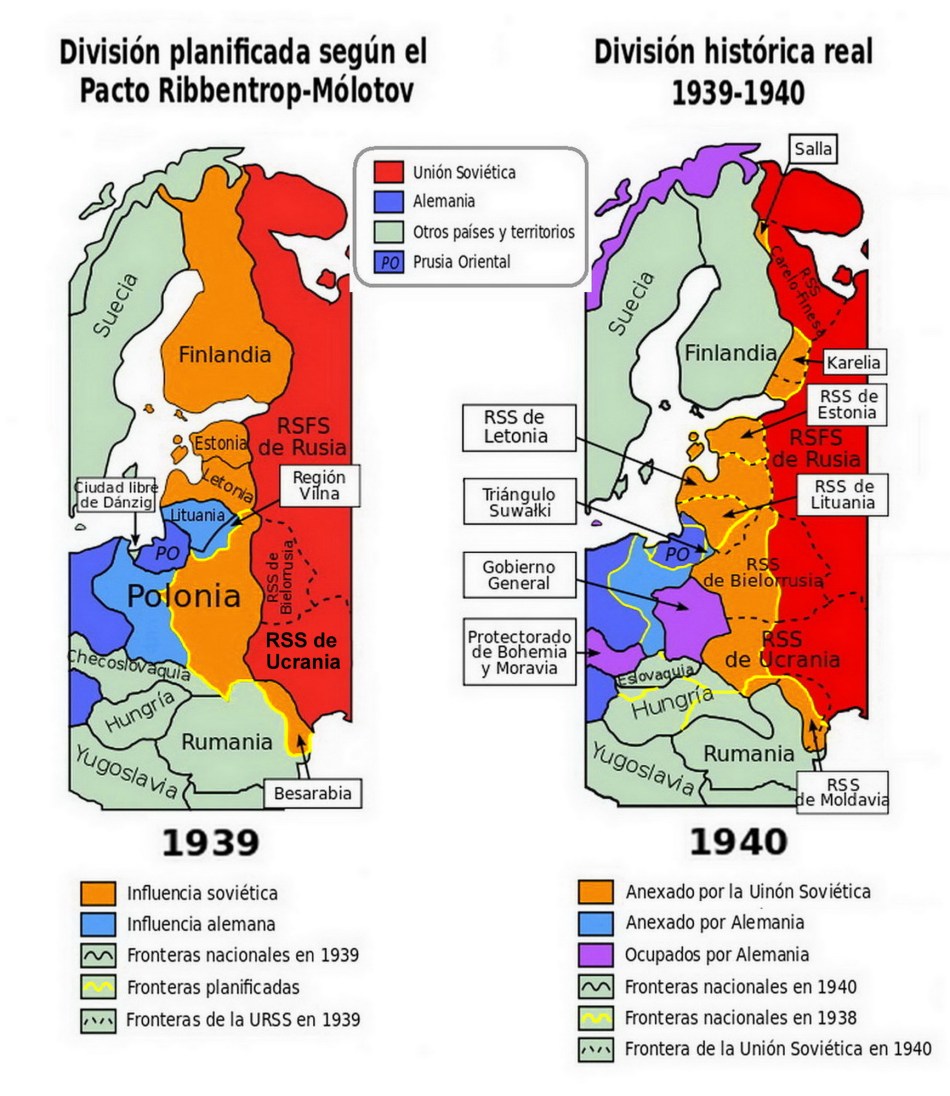 División planificada según el pacto Ribbentrop-Mólotov y división real.
