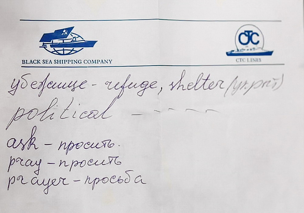 En el barco se encontró un papel en el que Gasinka había practicado palabras clave en inglés que podría necesitar en Australia, incluida la forma de pedir «refugio». La nota (en la foto) formaba parte de su expediente del KGB de Odesa, desclasificado en diciembre de 2020 por el SBU de Ucrania