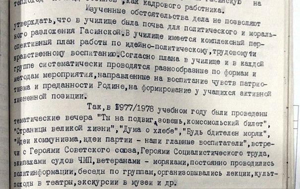 La comisión regional de educación visitó la escuela de Odesa para averiguar cómo estaban las cosas con la educación política. Raisa Goldwart, la maestra del grupo donde estudió Liliana, fue severamente reprendida por no «reconocer de manera oportuna los rasgos de carácter negativo de Gasinska y establecer su verdadero rostro y estilo de vida inmoral «. Los nuevos estudiantes debían ser observados más de cerca, particularmente en su tiempo libre, y recibir más conferencias sobre ‘la inminente victoria del comunismo’.