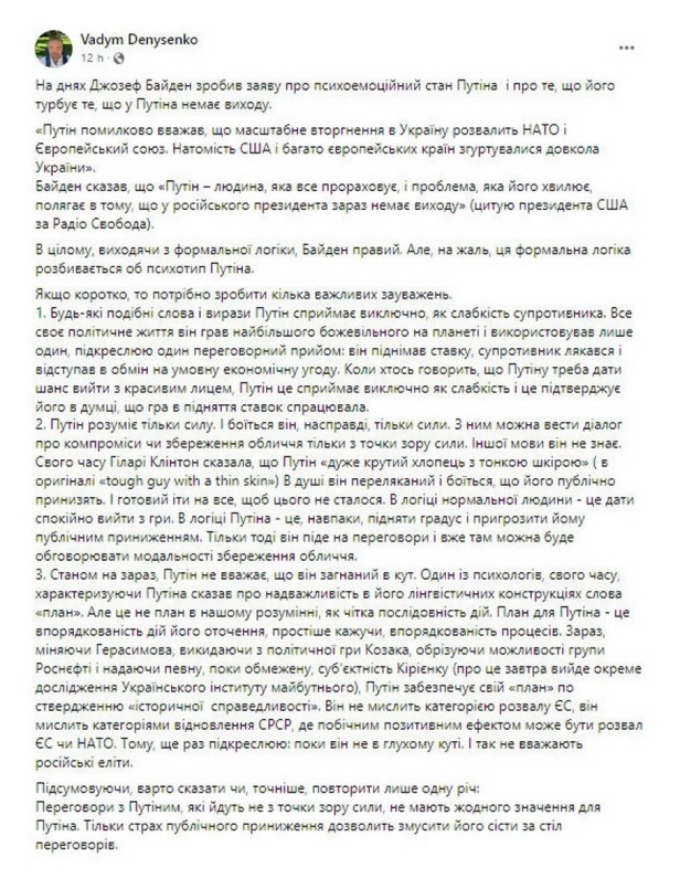 - A partir de ahora, Putin no cree estar acorralado. Un psicólogo en un momento dado, describiendo a Putin, dijo que la palabra «plan» era muy importante en sus construcciones lingüísticas. Pero esto no es un plan a nuestro entender como una clara secuencia de acciones. El plan para Putin es el orden de las acciones de quienes lo rodean, en pocas palabras, el orden de los procesos […] No piensa en términos del colapso de la UE, piensa en términos de la reconstrucción de la URSS, donde un efecto secundario puede ser el colapso de la UE o la OTAN…