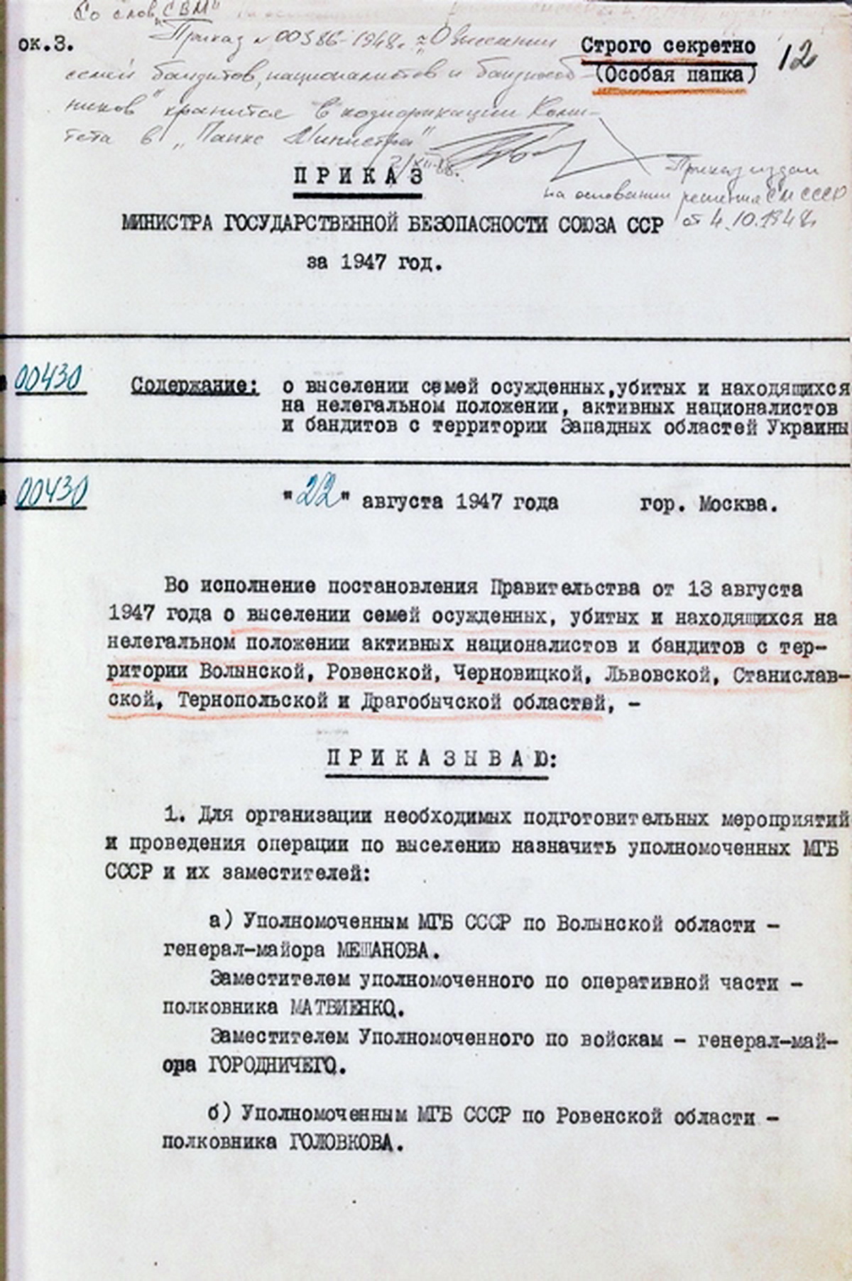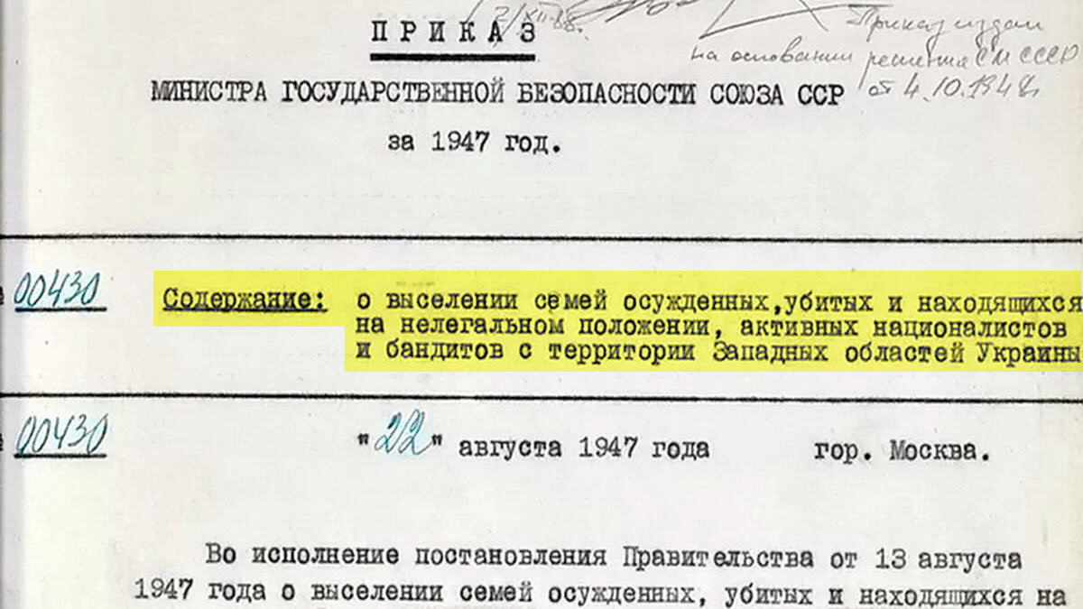 Orden 00430 del 22 de agosto de 1947 del Ministro de Seguridad del Estado de la URSS, Víktor Abakumov sobre el desalojo de familias de las regiones occidentales de Ucrania