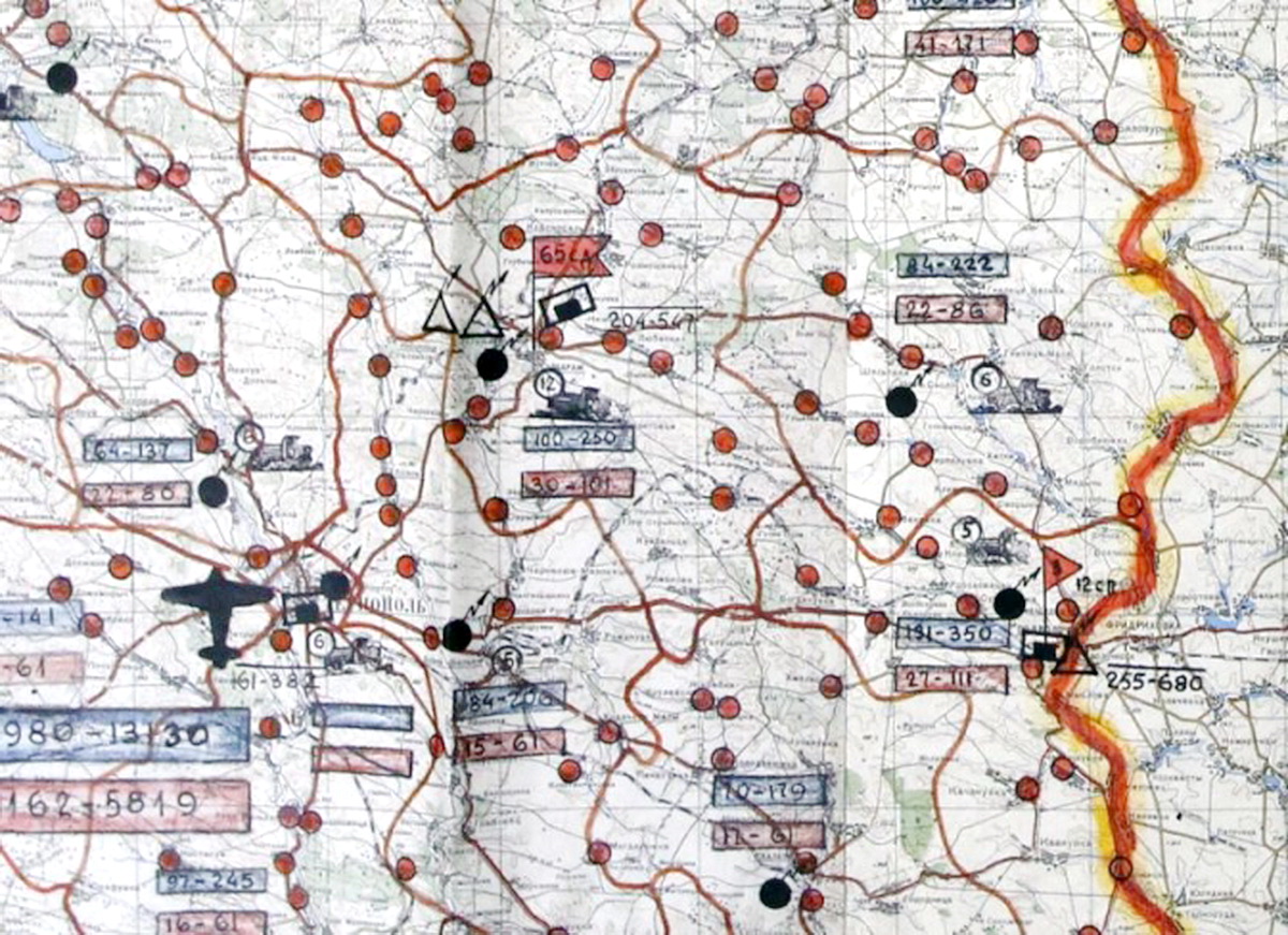 Detalle del mapa de la Operación Oeste en la región de Ternopil. Color azul: número de personas sujetas a deportación. Rojo: número de militares involucrados en la deportación. Los círculos naranjas son la ubicación de los grupos operativos.