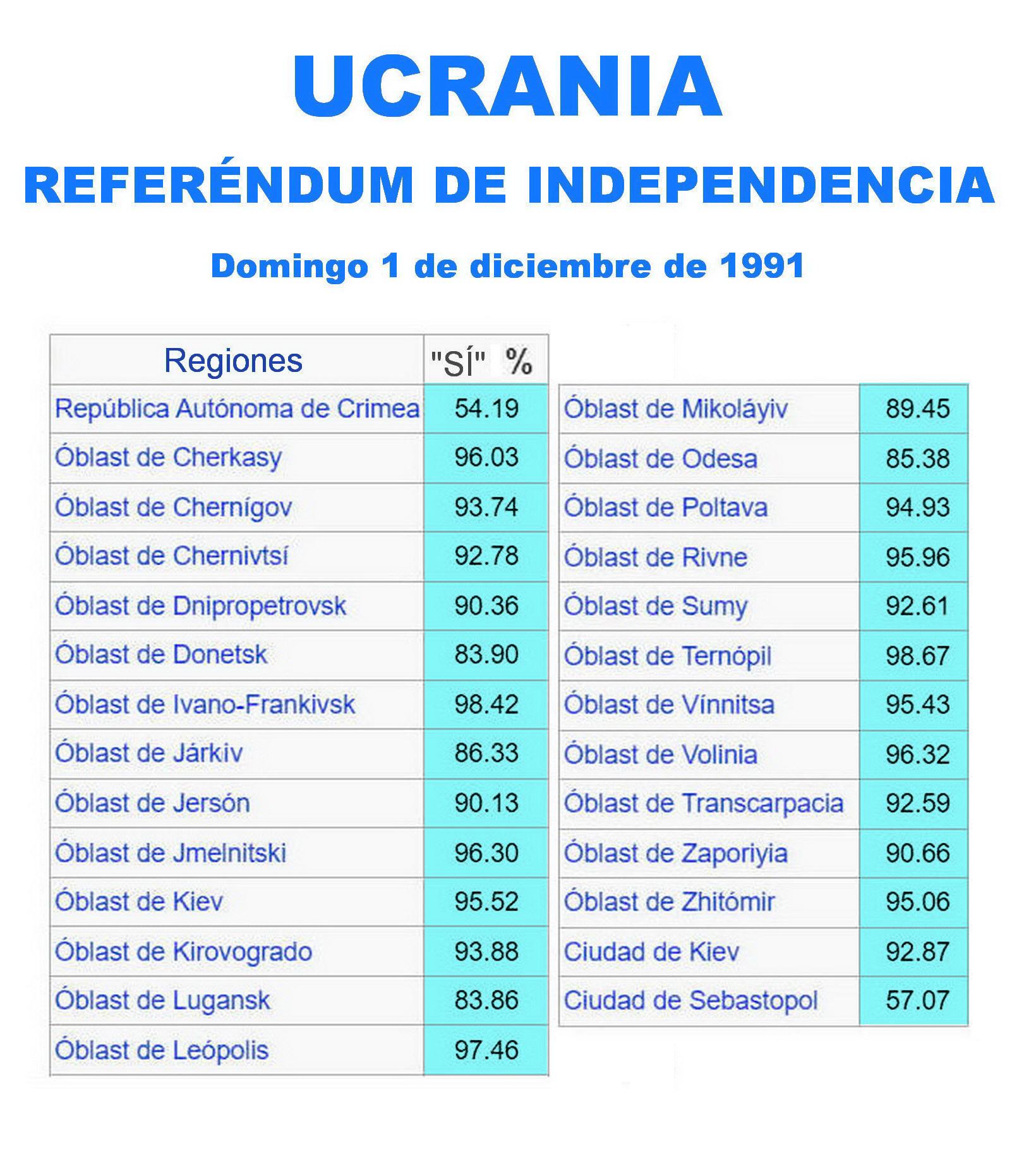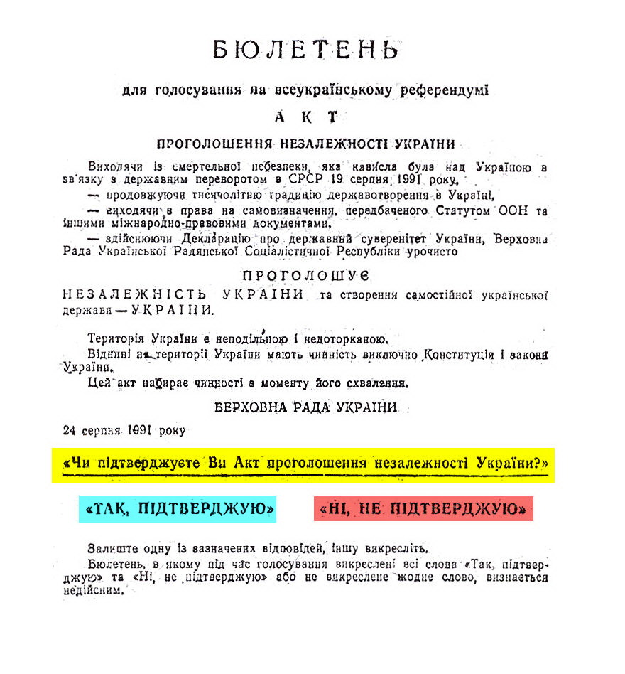 Tal día como hoy, domingo 1 de diciembre, pero de 1991, los ucranianos respondieron a la pregunta formulada en referéndum: «¿Confirma el Acta de Declaración de Independencia de Ucrania?».