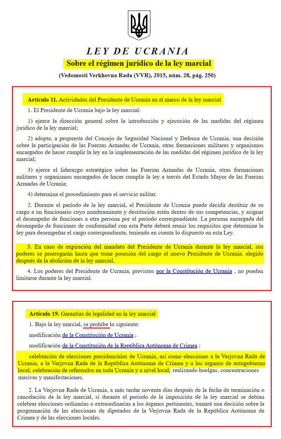 «En caso de expiración del mandato del Presidente de Ucrania durante la ley marcial, sus poderes se prorrogarán hasta que tome posesión del cargo el nuevo Presidente de Ucrania elegido después de la abolición de la ley marcial»