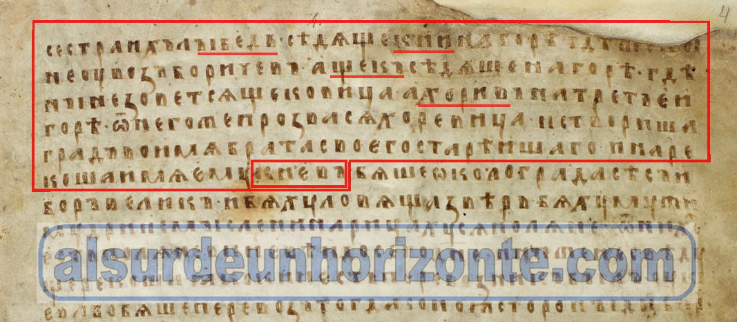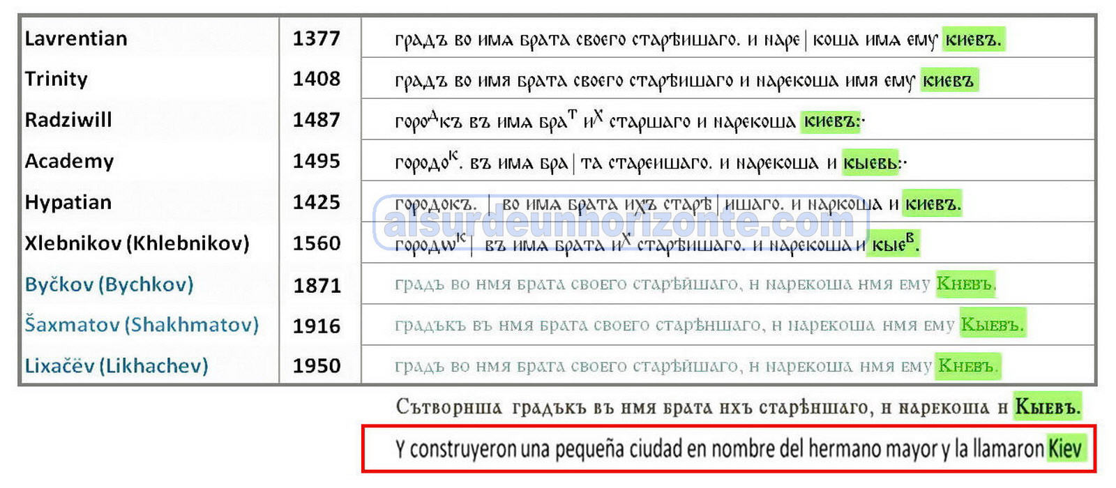 Se puede observar en el texto resaltado cómo aparece por dos veces el término Кыєвъ y más adelante Києвъ. Esto es un típico error del copista que aplica el término evolucionado y usado en los años de la copia en lugar del que aparece en el original copiado. Es lo que los expertos denominan ‘contaminación‘.