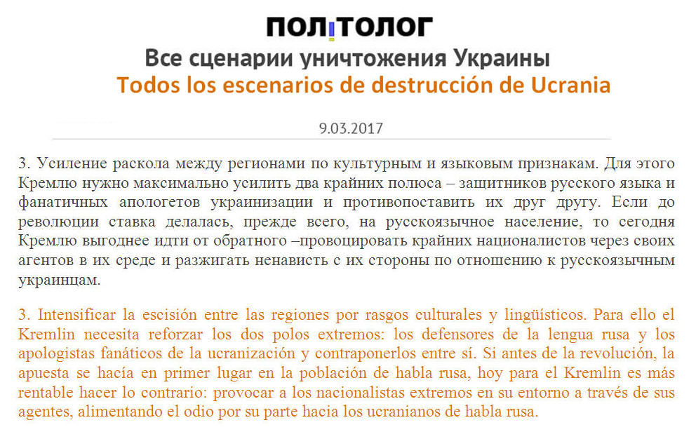 3 – Fortalecimiento de la división entre las regiones por razones culturales y lingüísticas. Para ello, el Kremlin necesita maximizar los dos polos extremos: la lengua rusa y sus fanáticos defensores y los apologistas de la ucranización, enfrentándolos entre sí. Si antes de la revolución la apuesta se hacía en primer lugar con la población de habla rusa, hoy para el Kremlin es más rentable hacer lo contrario: provocar a los nacionalistas extremos a través de sus agentes en su entorno, alimentando el odio por su parte a los ucranianos de habla rusa.