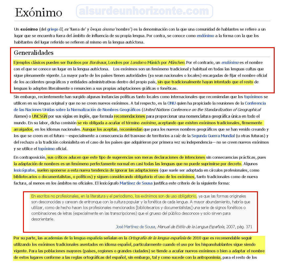 Exónimo: según la Ortografía de la lengua española (§3.1.2, p. 642), es el término «con que una comunidad de hablantes nombra un lugar que se encuentra fuera del ámbito de influencia de su lengua»