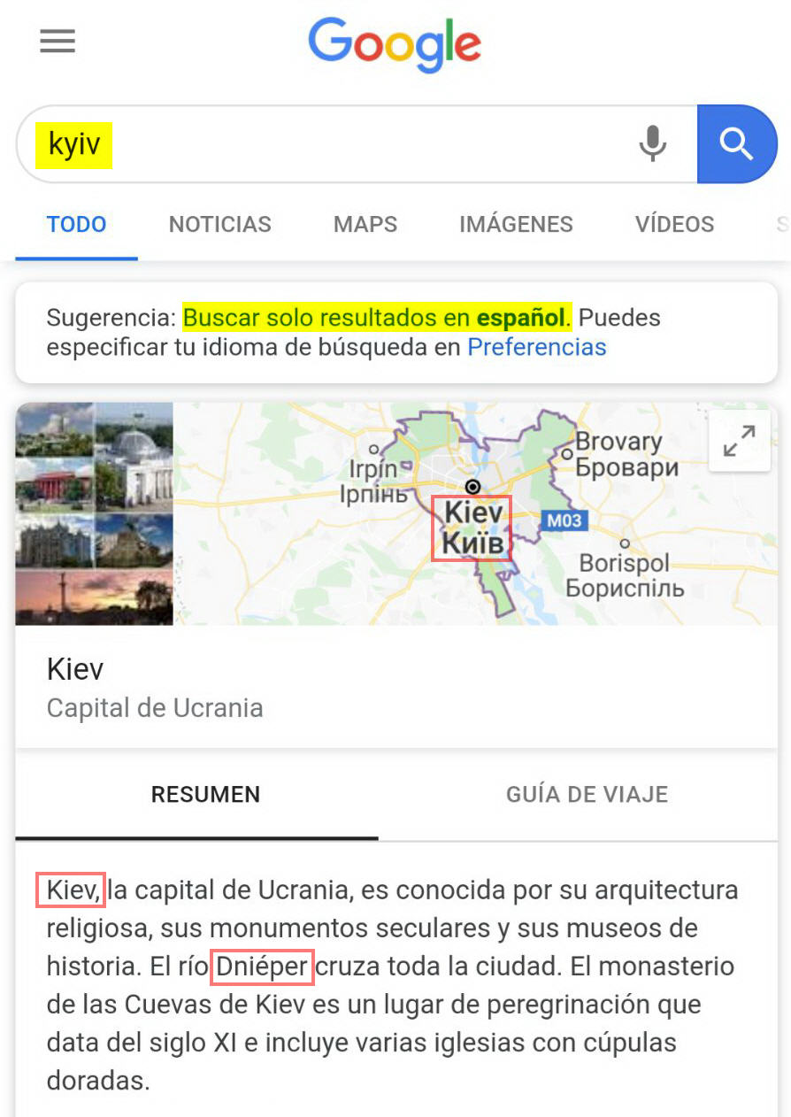 El que quiera usar la transliteración ‘Kyiv‘ en sus textos (creo que algunos siguen sin entender la diferencia entre transliterar, transcribir y traducir), es muy libre de hacerlo y no va a encontrar en mí a un detractor. Sólo pido igual trato para los que usamos la ortografía oficialmente aprobada en nuestro idioma, y sobre todo, que se frene la publicidad gratuita y errónea que afirma que el vocablo y la ortografía ‘Kiev‘ procede del idioma ruso.