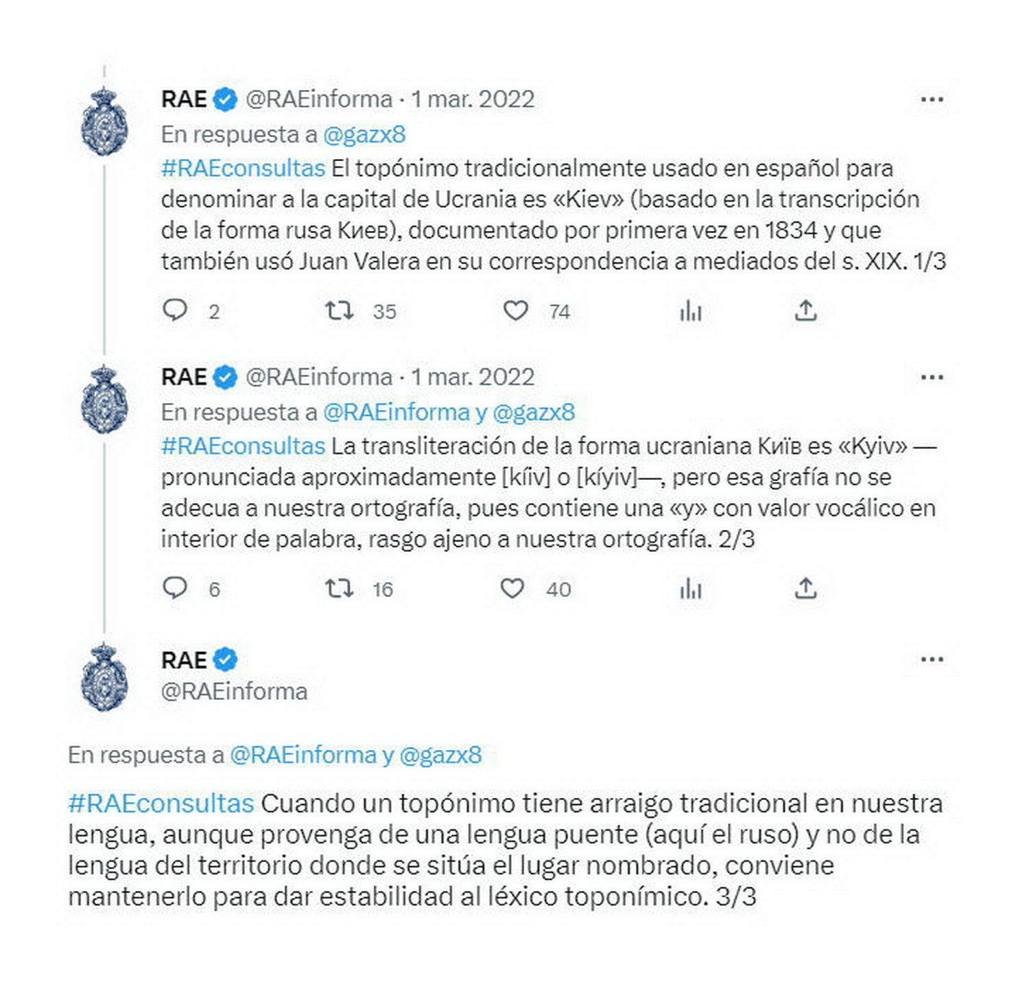 …La conversación siguió un tiempo. Me preguntó cuál era el motivo de querer que cambiásemos la ortografía y le contesté resumidamente que tras la agresión rusa, algunos ucranianos e hispanohablantes les molesta que el vocablo ‘Kiev‘ generalizado en muchos idiomas, coincida con la transliteración del cirílico del término ruso. Que debíamos sustituirlo por ‘Kyiv’ porque es la ortografía transliterada del cirílico del término ucraniano Київ, y que este movimiento de cambio se agrupa bajo la etiqueta: #KyivNotKiev.
