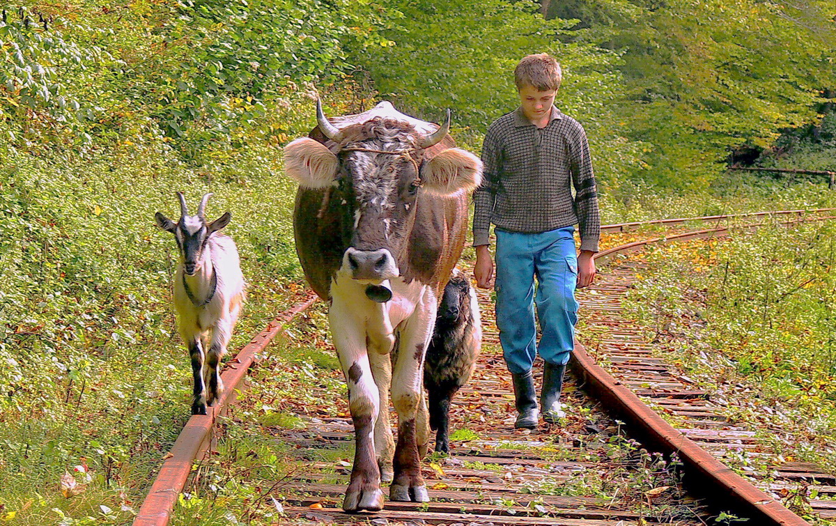 A mitad de camino a ninguna parte divisamos a lo lejos unas figuras que se acercaban andando por la misma vía. Al poco tiempo se distinguía la comitiva: un joven pastor con su vaca, una oveja y una cabra. La cabra como era de esperar y haciendo honor a su especie, entretenía su paseo con malabarismos de equilibrista sobre uno de los raíles. Aprovechamos para preguntar al chaval a qué distancia estaba la aldea de Dilove y que si era cierto que la vía estaba abandonada.