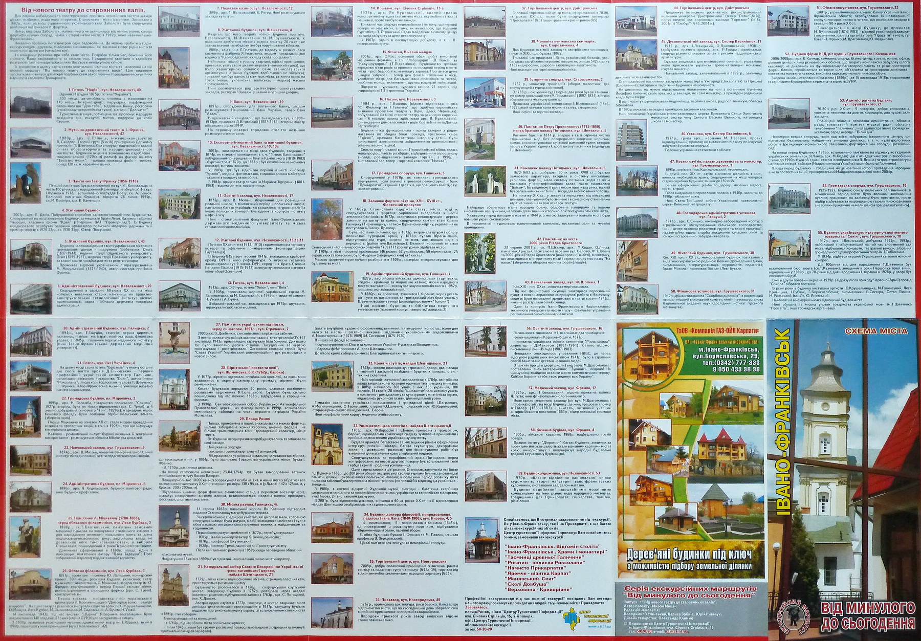 Como puede verse por su representación, es fácil orientarse a simple vista. En el reverso figura una lista con las explicaciones de los 55 puntos a visitar. El problema una vez más es que todo está en ucraniano, (salvo el título del plano traducido al inglés). Alguna información aislada con suerte la encuentras en inglés, pero muy pocas, y naturalmente NADA de NADA si la zona no es turística. Aquí como en tantos sitios de Ucrania el turismo es interno y no se esfuerzan lo más mínimo en intentar captar al forastero, aunque esta tendencia está cambiando últimamente. Digamos que aquí un extranjero “viene”, no “le llaman”. Por otro lado ya he comentado en más de una ocasión lo importante que es saber por lo menos el alfabeto cirílico pues son muchas las palabras y términos que podemos deducir por su parecido fonético, además de memorizar unas cuantas fundamentales. Para esto y sabiendo el alfabeto, sólo queda transliterar. Tampoco digo que dominando el alfabeto esté todo solucionado.