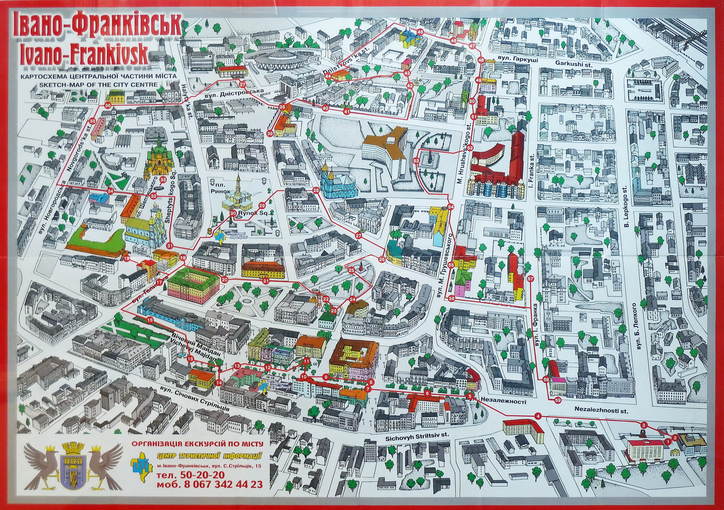 Después de andar unos 15 minutos desde el abtovokzal (ver ruta verde en el plano de Google Maps) llegamos al Centro situado en la Plaza del Mercado (Ploscha Rinok). Una vez allí, en la esquina suroeste está el kiosko de información turística (rara avis) con suficiente información de la ciudad, encontrando un plano de gran ayuda: