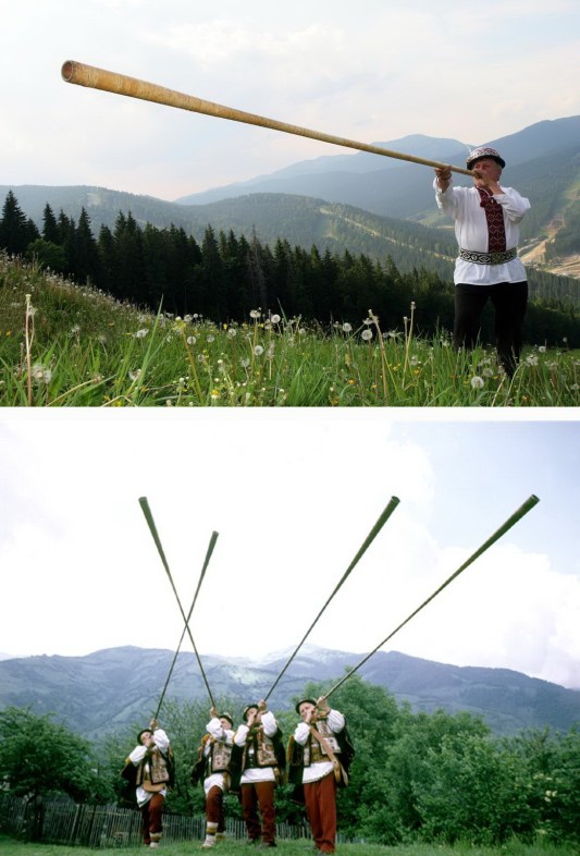 La elección del material para estas trompetas de los Cárpatos es muy curiosa; se suele utilizar para su elaboración los troncos de los arboles que han sido alcanzados por un rayo, lo que provoca una mayor sonoridad de la madera al cambiar sensiblemente su estructura y propiedades debido a tan descomunal descarga.