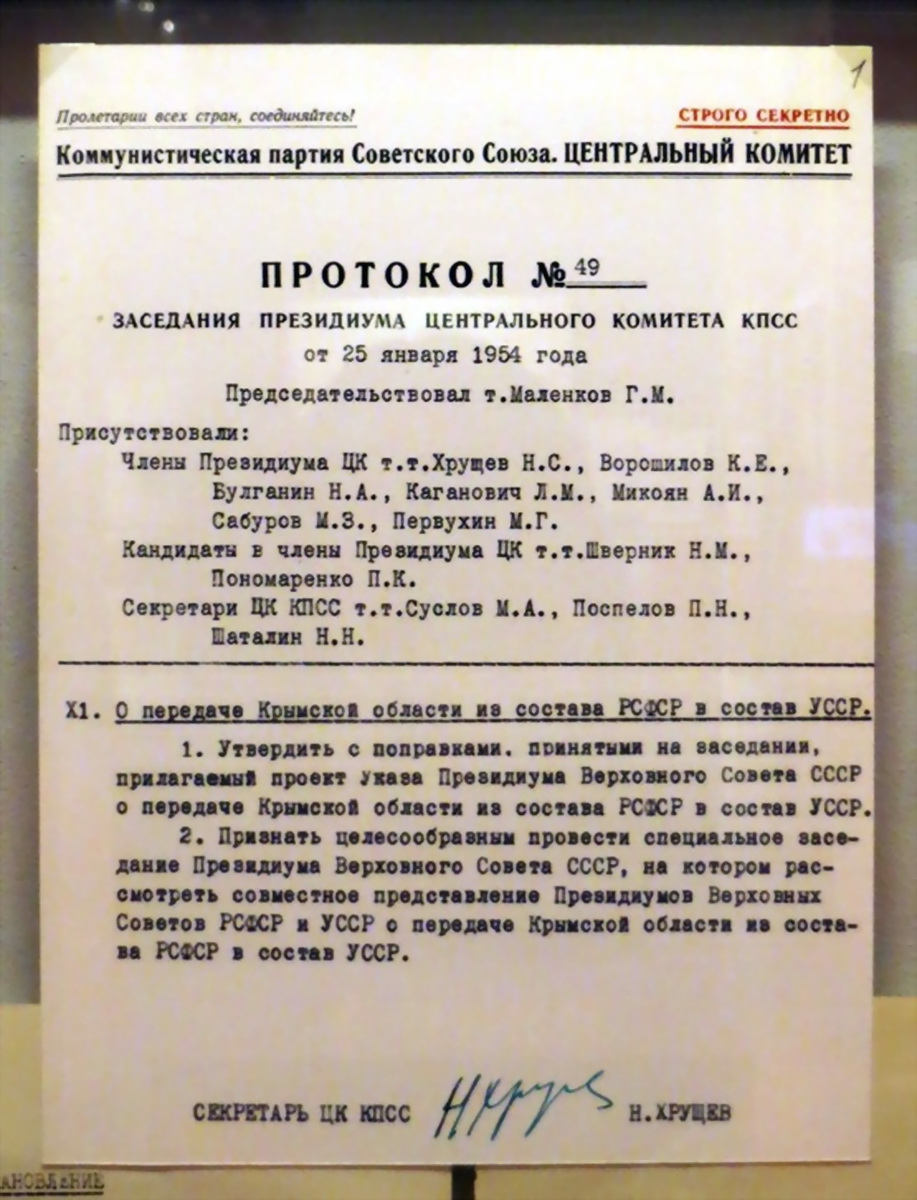 En la transcripción de la reunión del Presidium del Soviet Supremo de la URSS de 19 de febrero de 1954, que fue aprobado por el Decreto del Presidium del Consejo Supremo de la URSS de 19/02/1954 sobre la transferencia de la región de Crimea de la RSFSR a la RSSU, Jrushchev nunca fue mencionado. Parece ser por la transcripción que ni siquiera estuvo presente en la reunión.