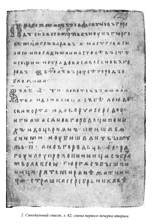 La copia más antigua existente de los primeros anales de Nóvgorod es el primer resumen de la llamada Lista del Sínodo o Copia Sinodal (1017-1352) (Primera Crónica de Nóvgorod Alta o Vieja recensión). Fechada en la segunda mitad del siglo XIII (aprox. 1280) es el manuscrito conservado más antiguo de una crónica eslava del este, precediendo a la copia de la Crónica de Néstor “Relato de los años pasados” incluida en el Códice Lauretiense (1377) en casi un siglo.