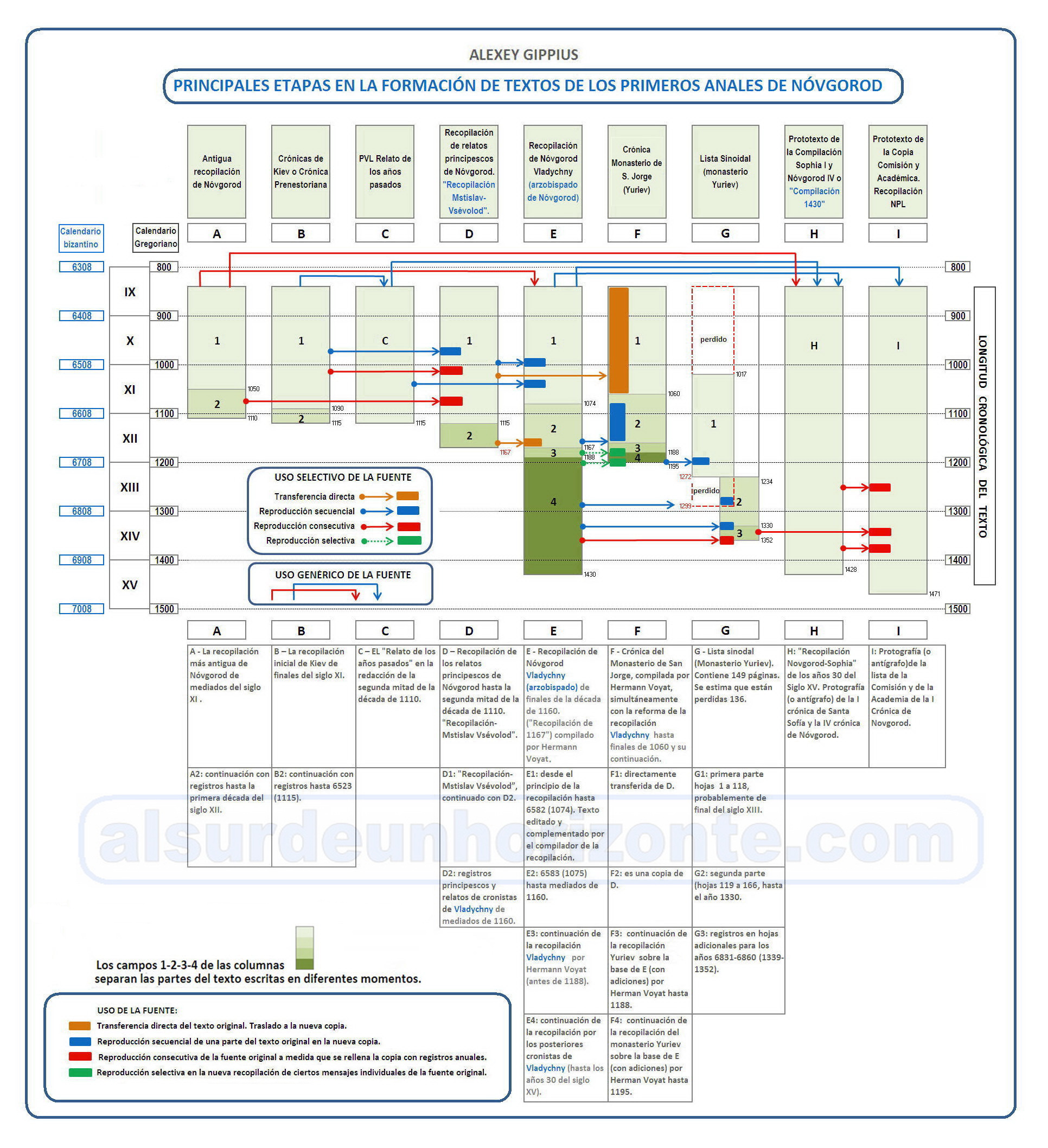 Cuadro elaborado con los datos aportados por Aleksey Gippius donde indica la cronología de las aportaciones realizadas entre las diferentes copias existente y de las que se tienen referencias, así como las diferentes etapas en la elaboración de los manuscritos.