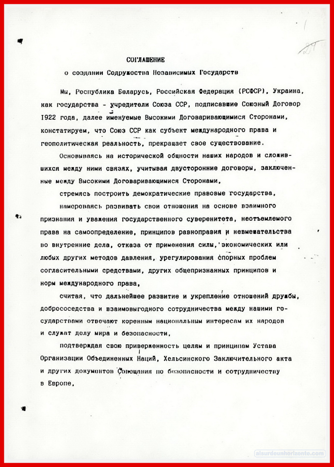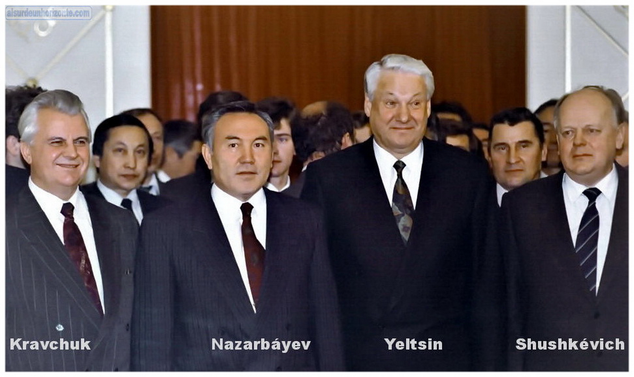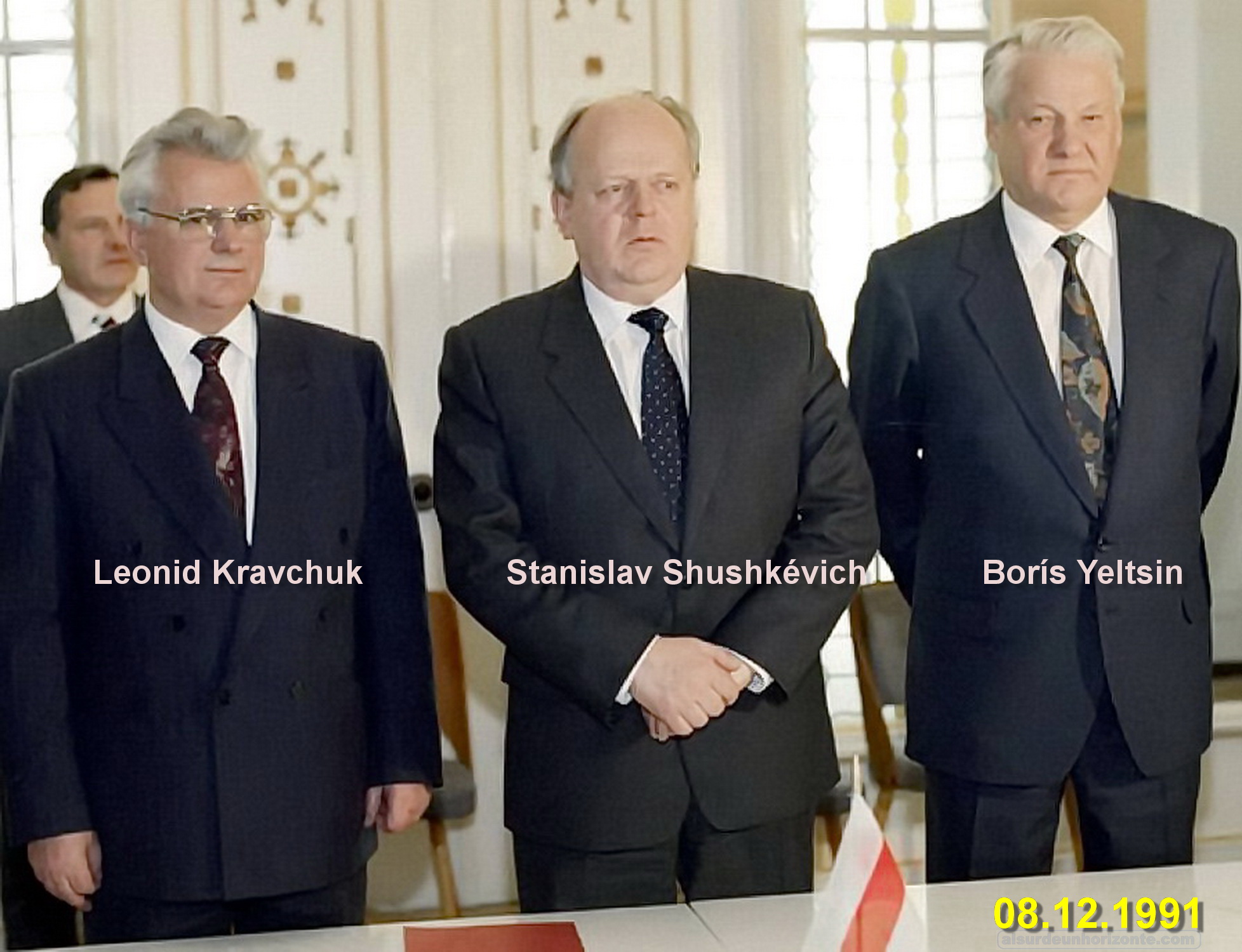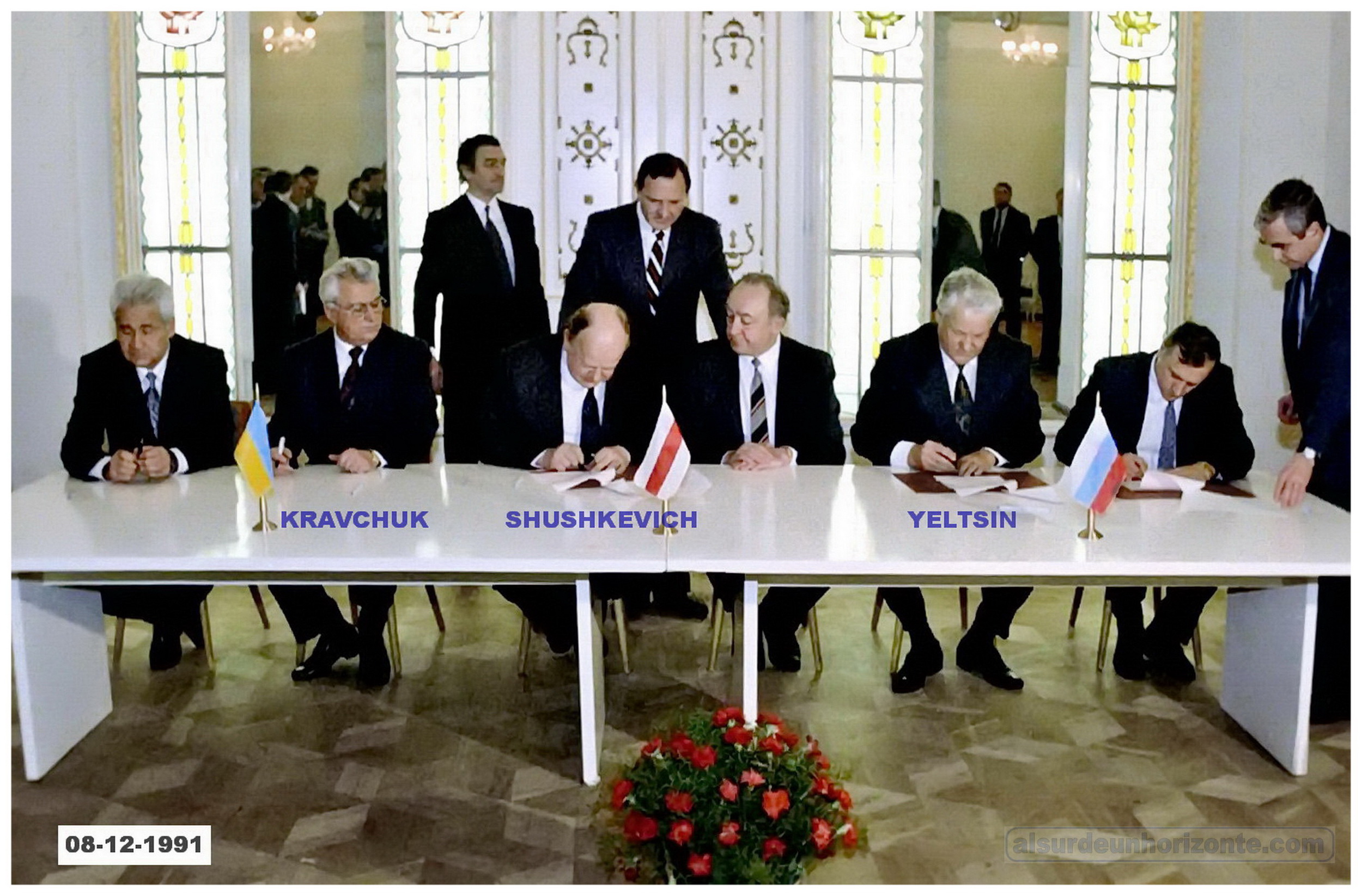 Los líderes de Rusia, Ucrania y Bielorrusia se reúnen en el pabellón de caza de Visculí, en medio del bosque de Belavezha (Bielorrusia) para firmar apresuradamente la disolución de la Unión Soviética y la creación de la Содружество Независимых Государств (СНГ) o “Unión de Estados Independientes” (SNG) conocido en occidente como la Comunidad de Estados Independientes (CEI).