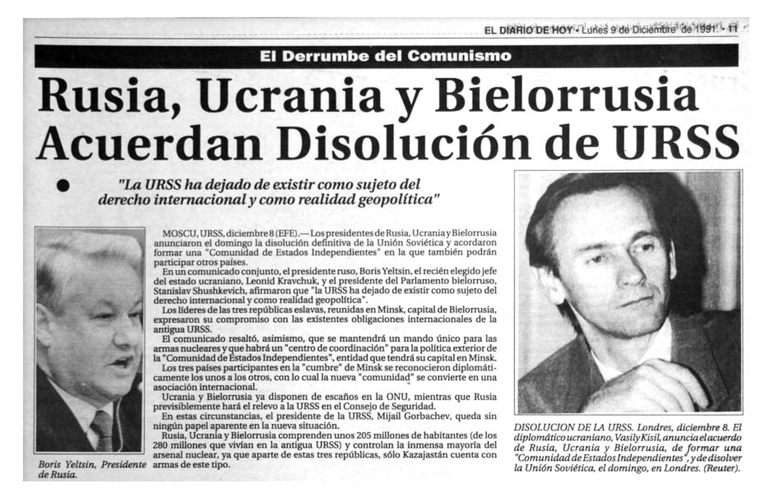 8 de diciembre de 1991. Acuerdo de Belavezha para la disolución de la URSS