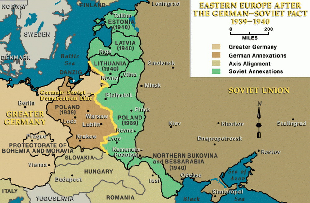LA URSS OCUPA LAS REPÚBLICAS BÁLTICAS (JUNIO, 1940). El Pacto Germano Soviético de agosto de 1939 establecía en su Protocolo Secreto una división de Europa del Este entre la URSS y la Alemania nazi. Finlandia, Estonia y Letonia quedaron bajo influencia soviética. Poco después, por el Tratado Germano-Soviético de Amistad, Cooperación y Demarcación también Lituania quedaba en el ámbito de expansión soviético. El mapa muestra el momento en que la URSS materializó el contenido de ambos tratados. (Imagen del blog de historia del mundo contemporáneo del profesor ©Pedro Oña)