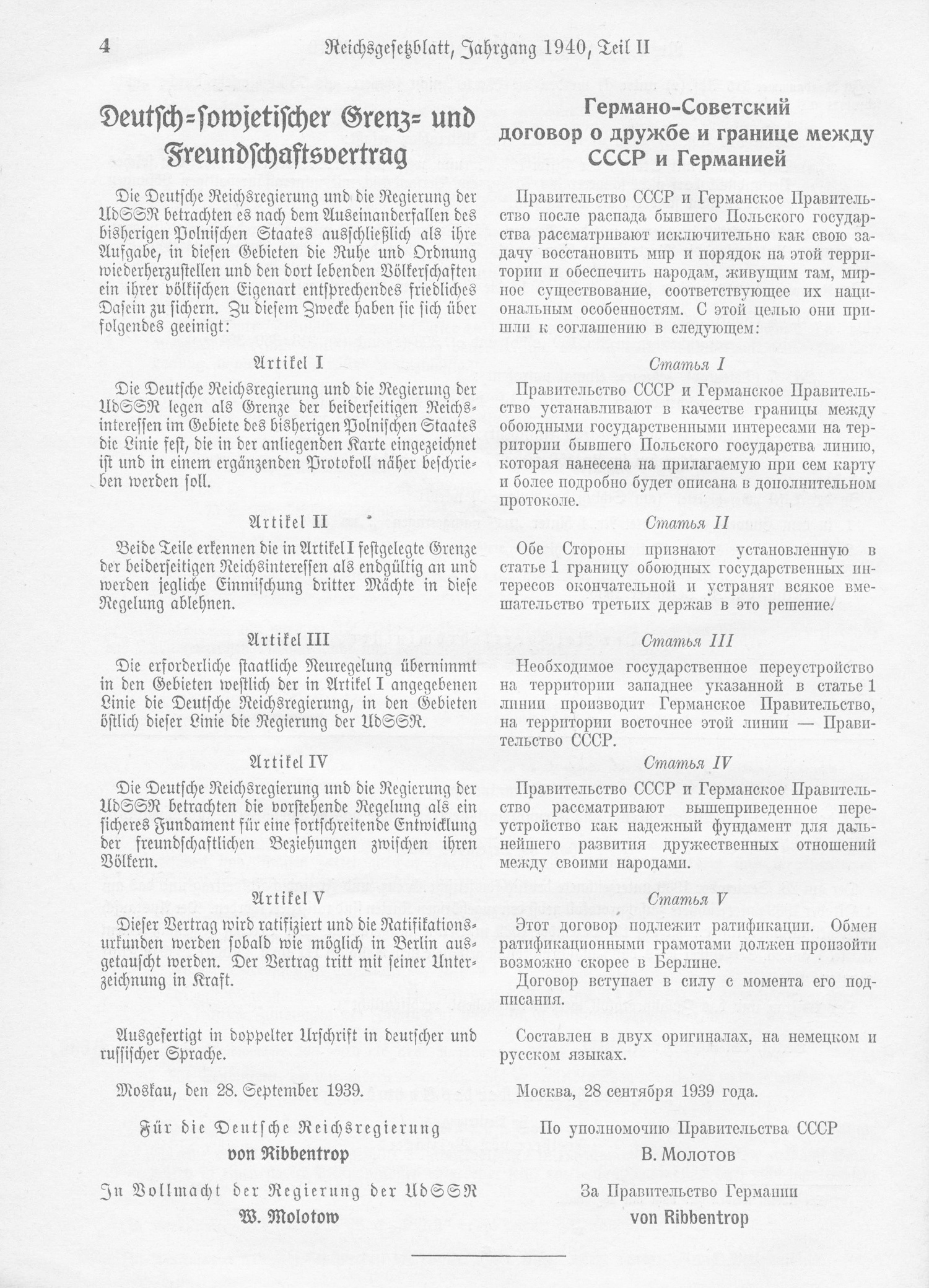 «Después del colapso del antiguo estado polaco, el gobierno de la URSS y el gobierno alemán consideran exclusivamente su tarea de restaurar la paz y el orden en este territorio y proporcionar a los pueblos que viven allí una existencia pacífica que corresponde a sus características nacionales. Con este fin, han llegado a un acuerdo de la siguiente manera:»