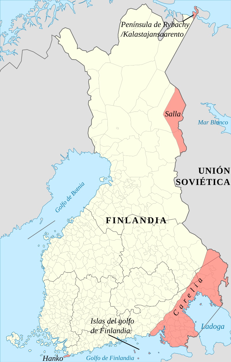Mapa de las áreas cedidas por Finlandia a la Unión Soviética después de la Guerra de Invierno de 1940. ( Autor: Jniemenmaa, Fenn-O-maniC, rowanwindwhistler)