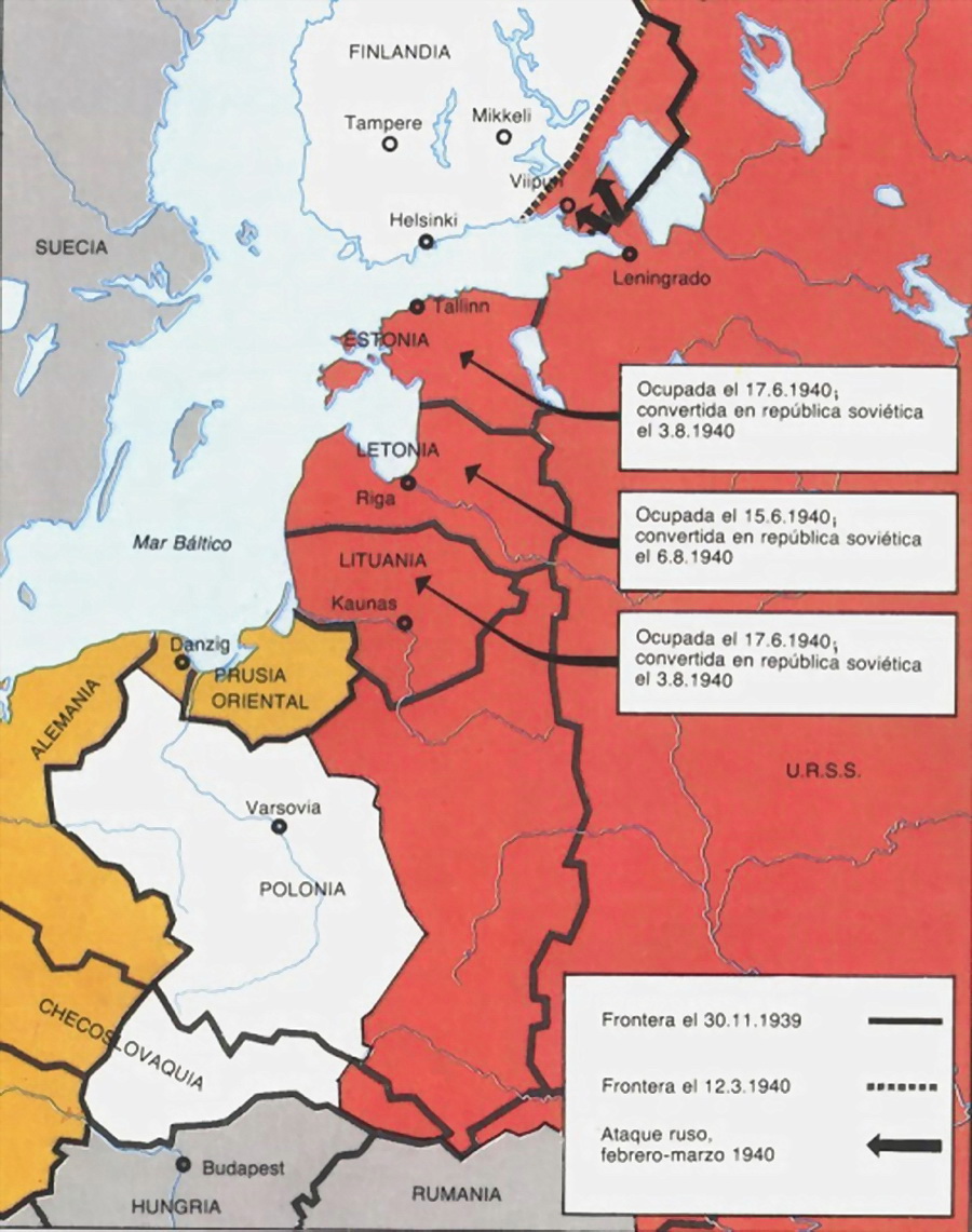 De idéntica forma, Alemania guardó silencio ante el ataque de la Unión soviética contra Finlandia el 30 de noviembre, siendo expulsada poco después de la Sociedad de Naciones. En junio de 1940 y principios de julio después de unos acuerdos impuestos de ‘ayuda mutua’, la URSS ocupa Estonia, Lituania, Letonia y se anexiona Bukovina del norte y Besarabia en el Reino de Rumanía.